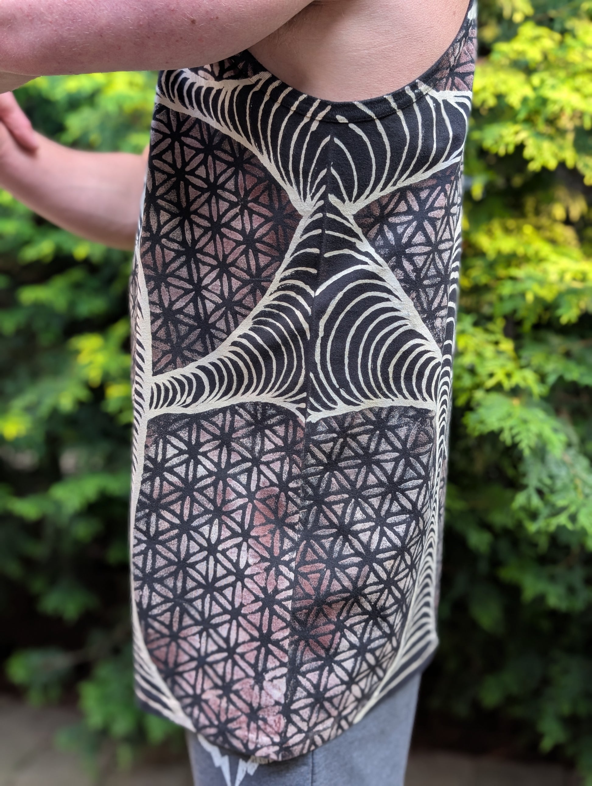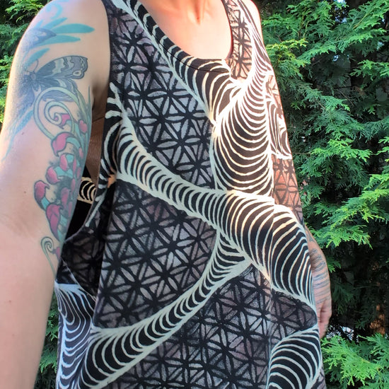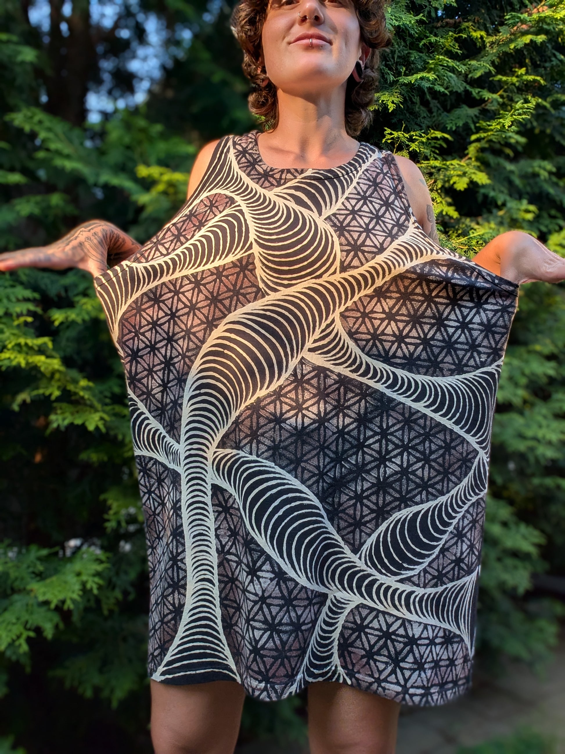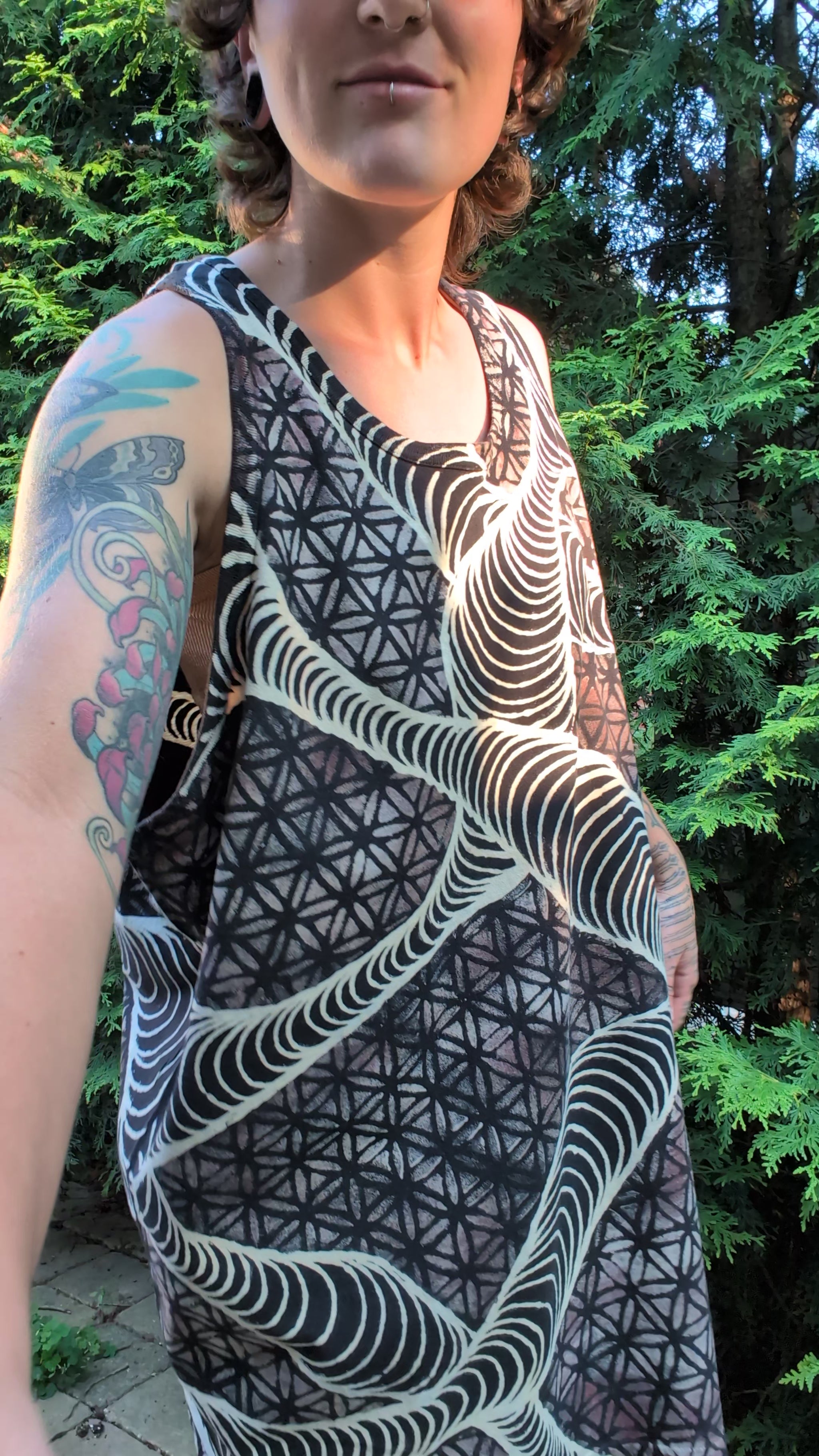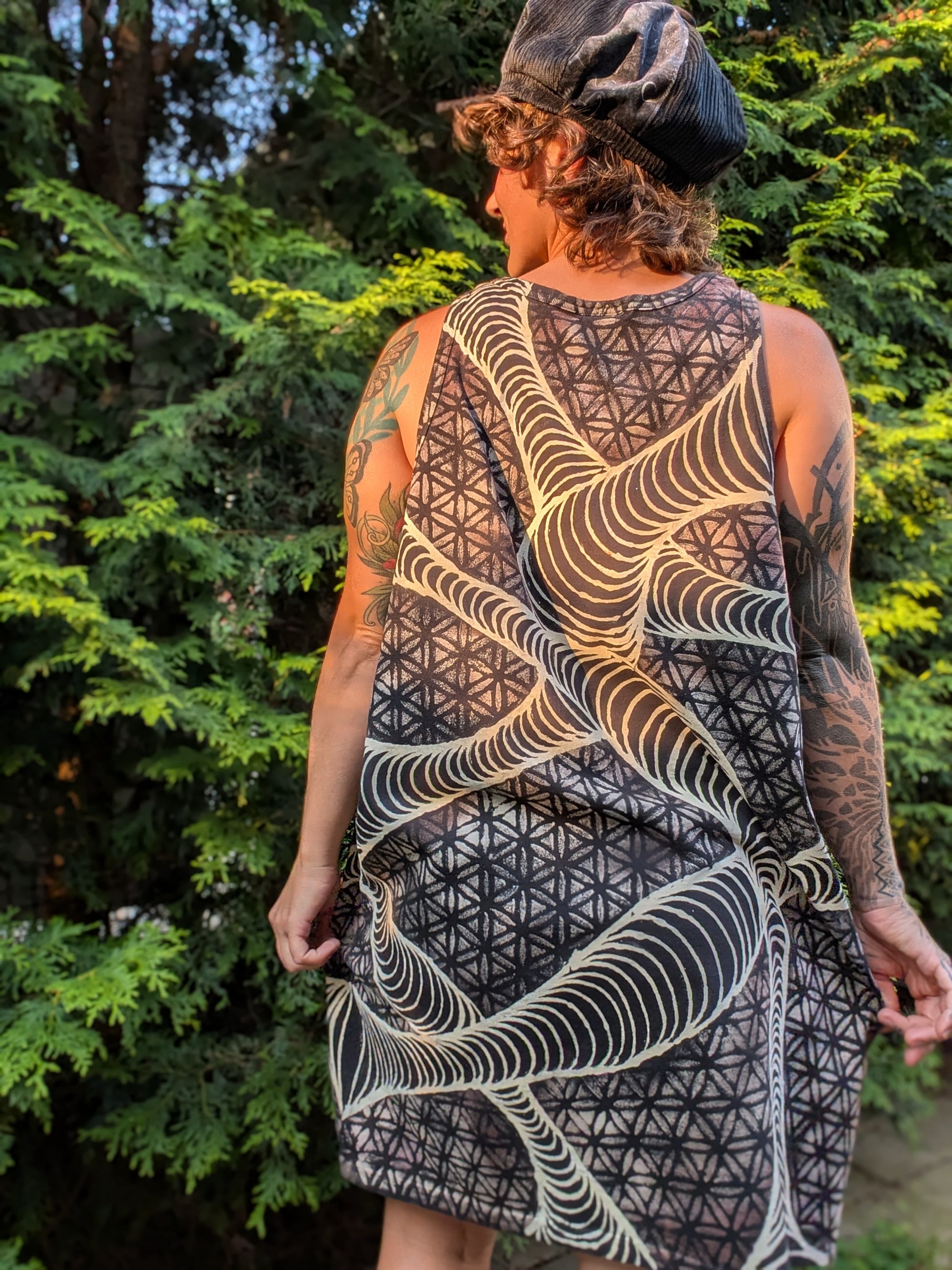 This was a labor of love & worth every hour spent making it!! Featuring hand drawn designs on both sides and the sacred flower of life throughout. This is truly versatile and can be worn as intended as a tank, or even on tiny people like me as a dress! This tank is made of incredibly soft, 100% cotton.