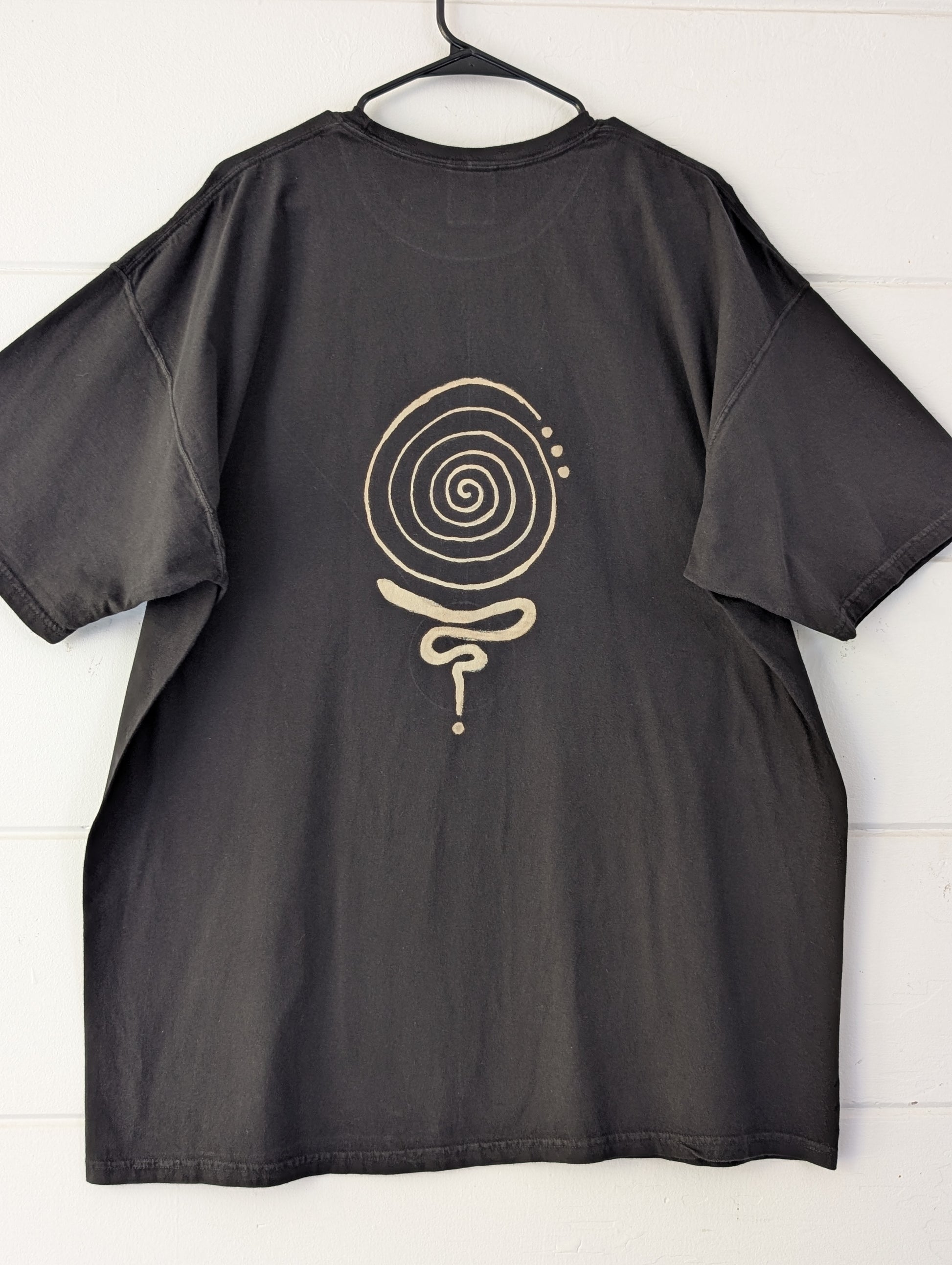 This shirt is 5.5 oz., American grown 100% ringspun cotton. It features hand drawn sacred symbols on the front & back. This sacred shirt holds a gentle reminder and intentional magic.