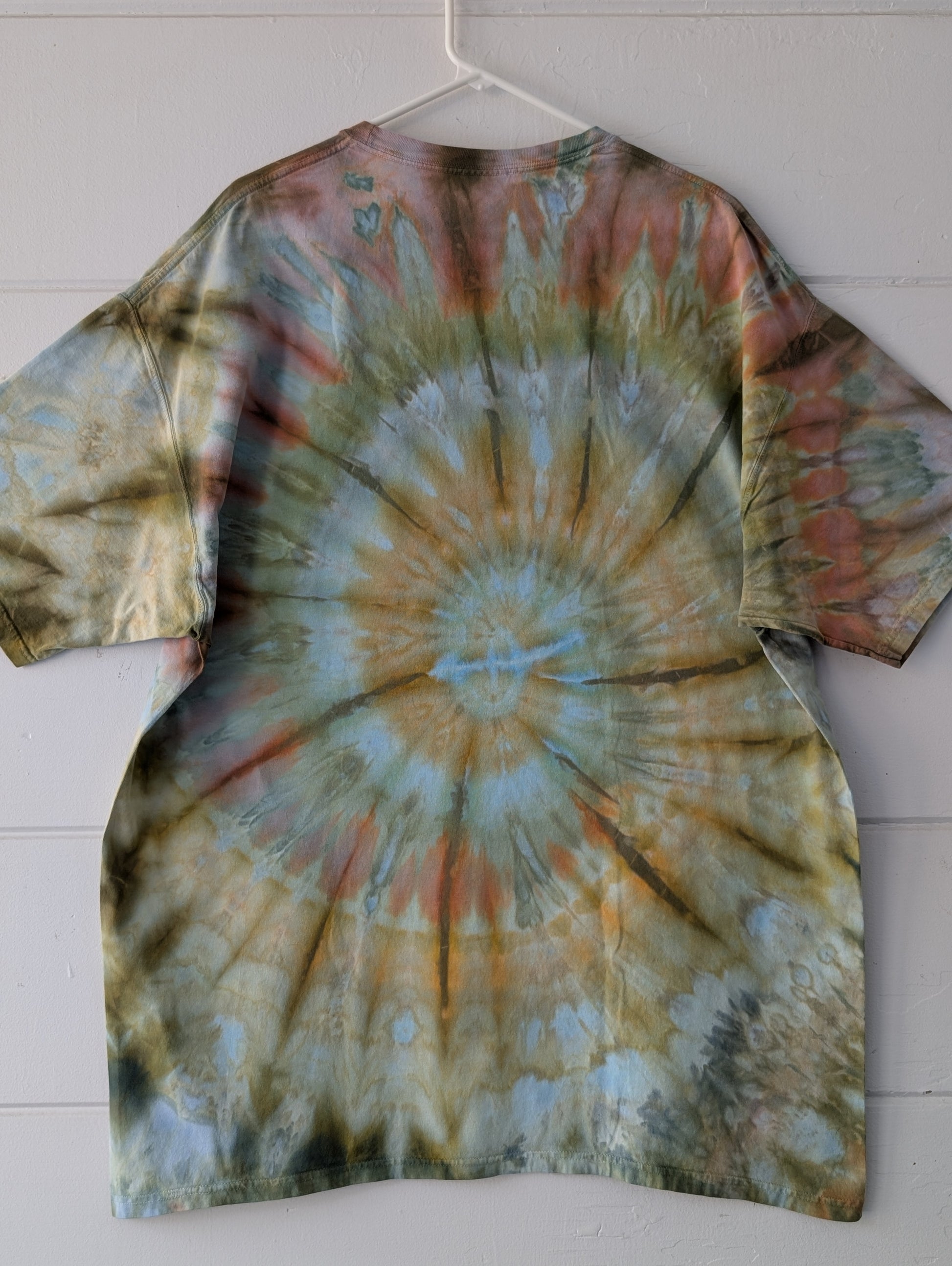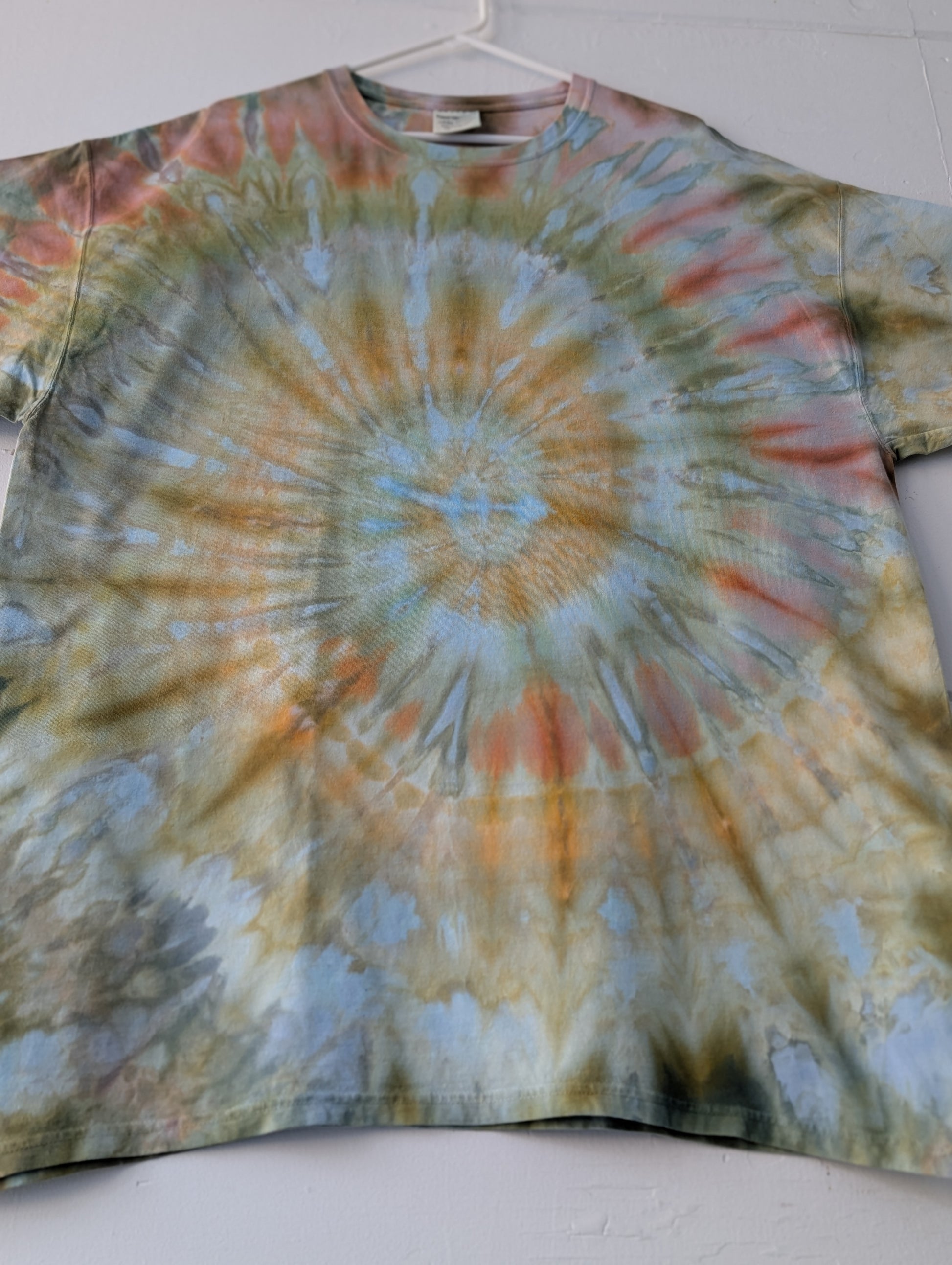 This shirt is 5.5 oz., American grown 100% ringspun cotton. It features a psychedelic ice dyed spiral ꩜