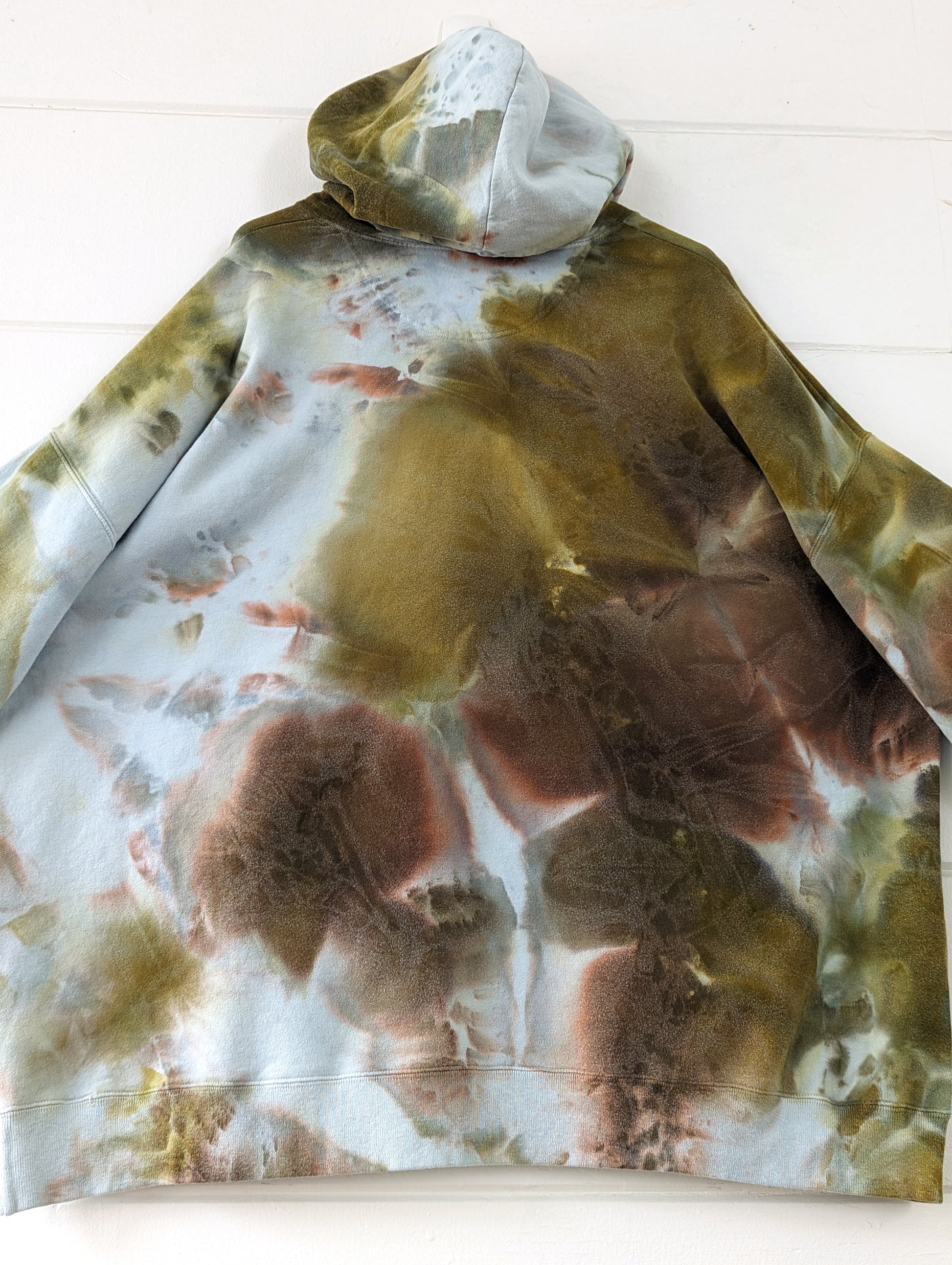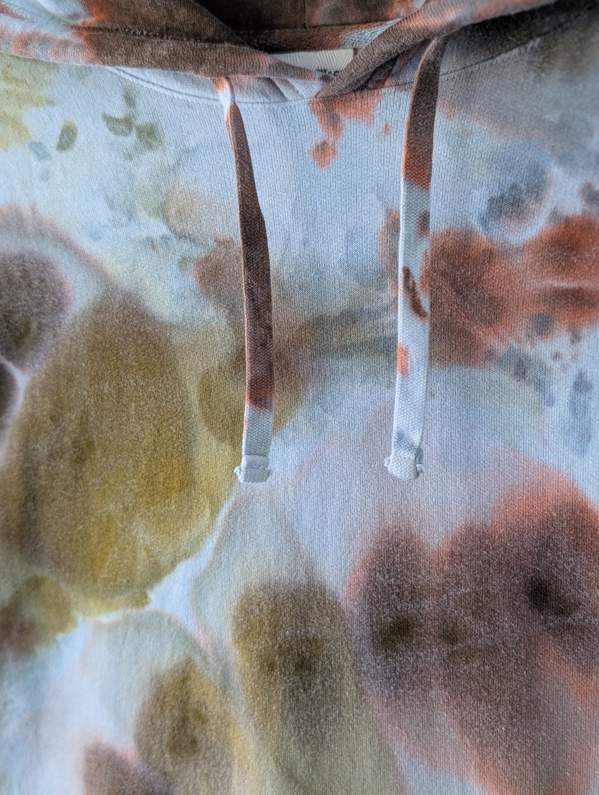 This hoodie is 8.5 oz., 80/20 cotton poly blend. The inside lining is a super soft polyester fleece blend. It features an all over flowy psychedelic hand dyed design that was made with so much love!