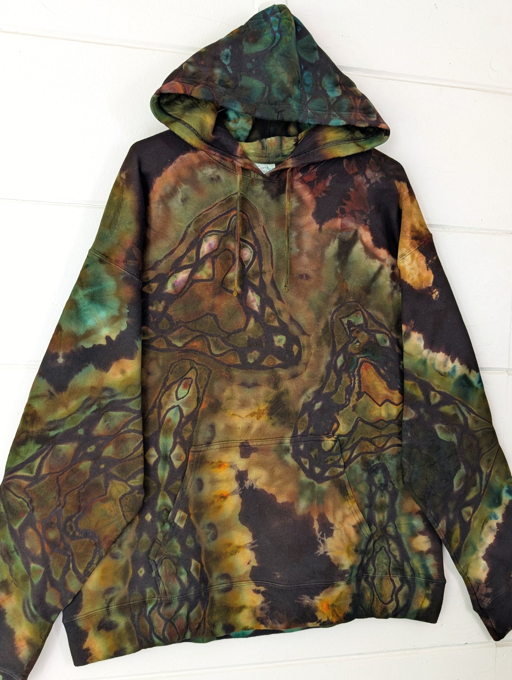 This hoodie is 7.2 oz., 80/20 cotton poly blend. The inside lining is a super soft polyester fleece blend. It features a large sacred prism on the back hood & sleeves, and two large psychedelic mushrooms on the front. This hoodie was made with so much friggin love! ♡