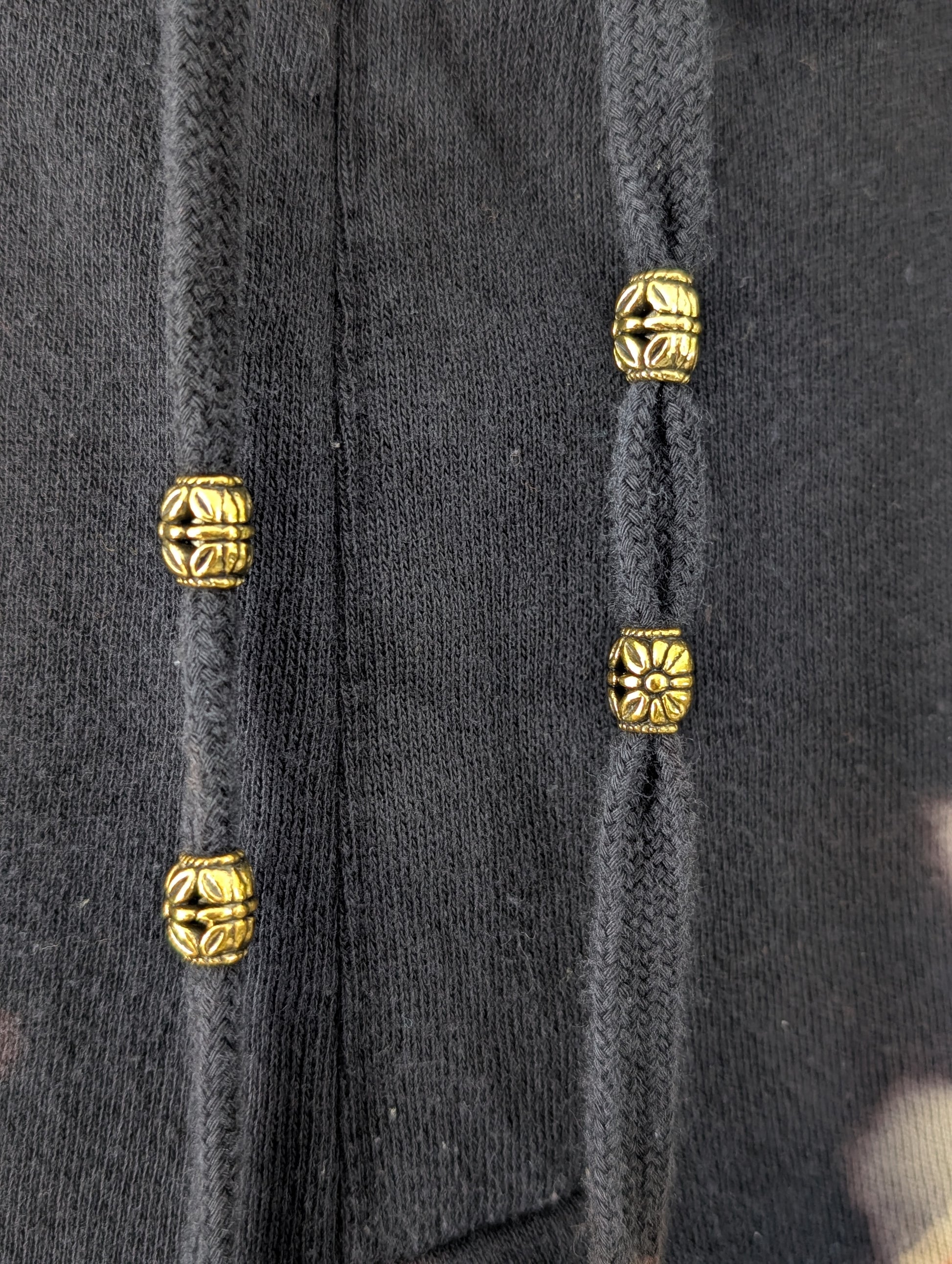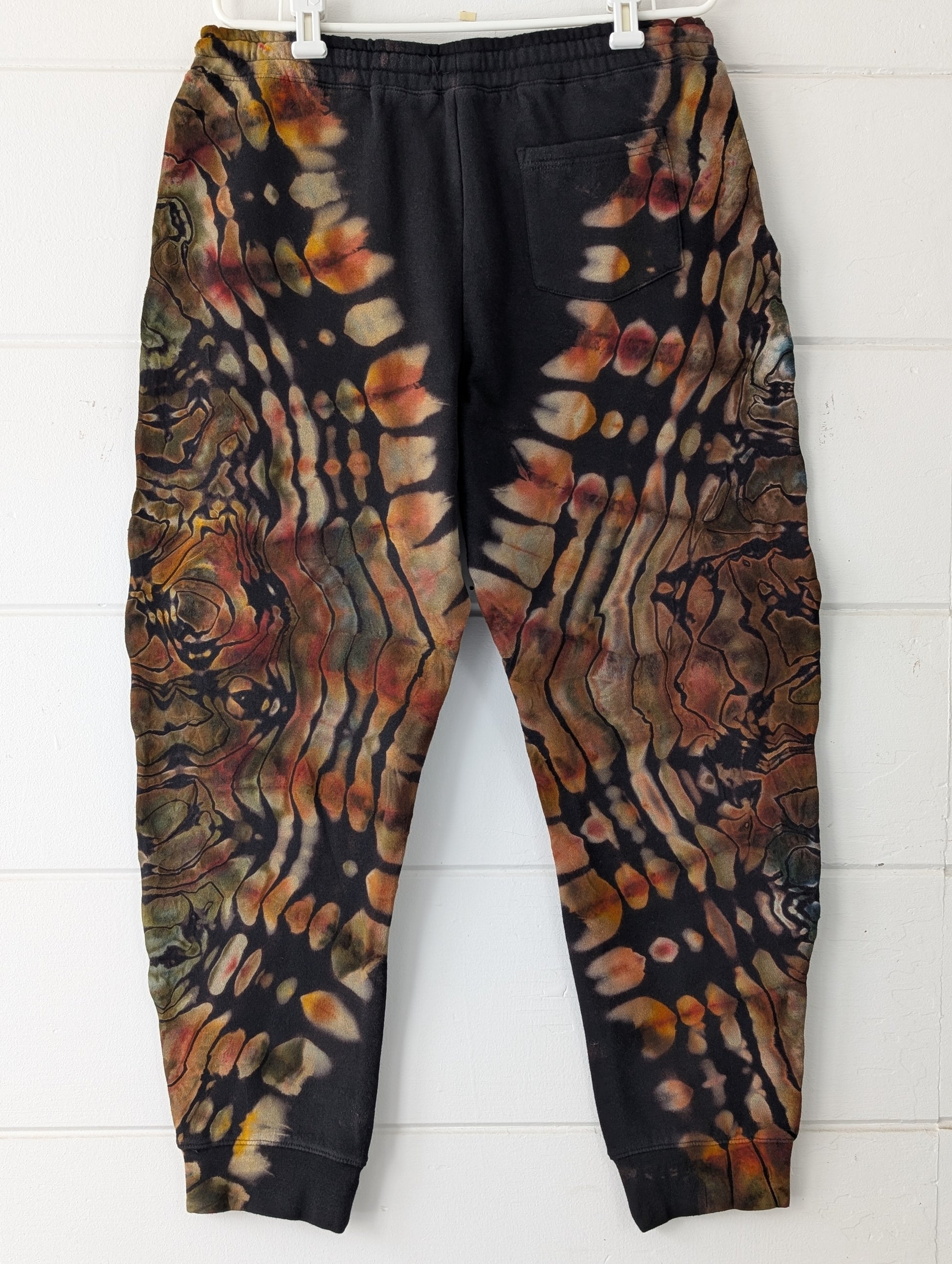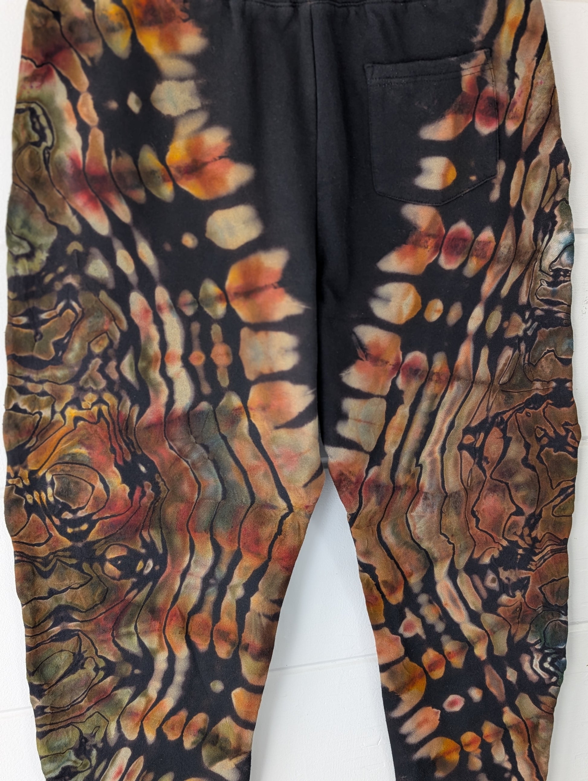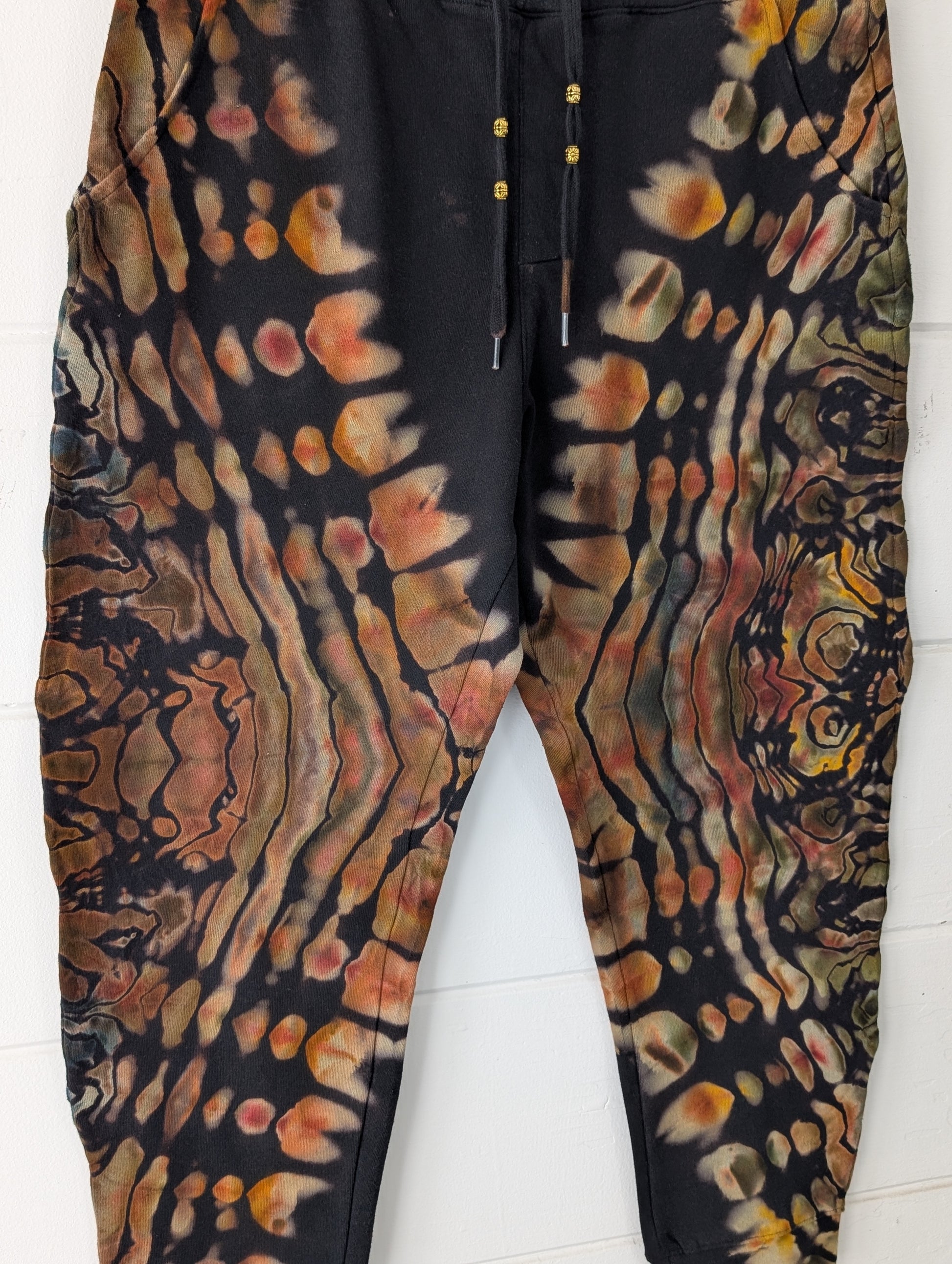 These sweats are 8.5 oz. ring spun cotton. They have a polyester blend fleece on the inside lining, 2 side jersey lined hand pockets and a small back pocket. Each leg has a unique hand dyed psychedelic design and beaded strings. They are warm, cozy & made with so much love!