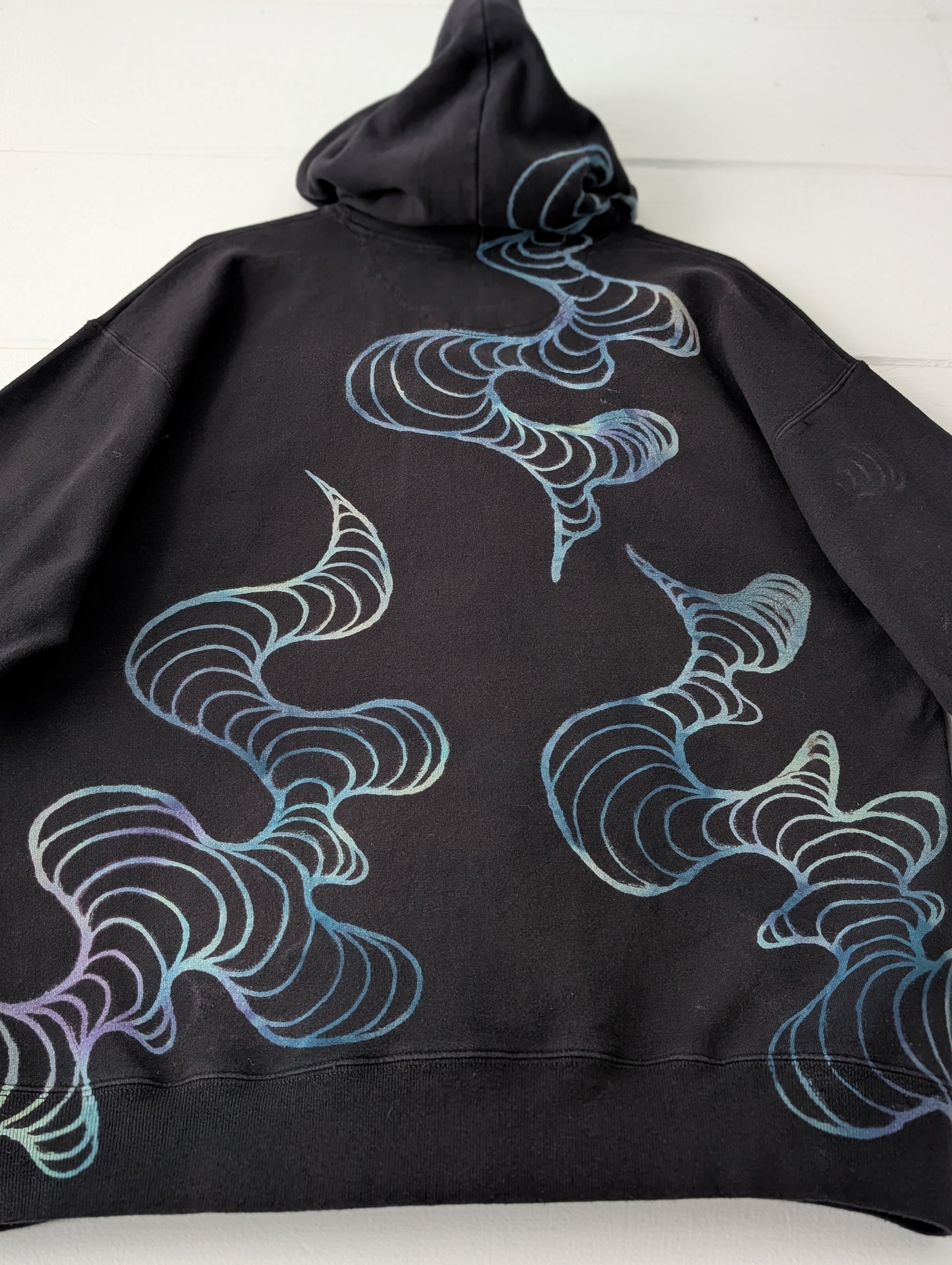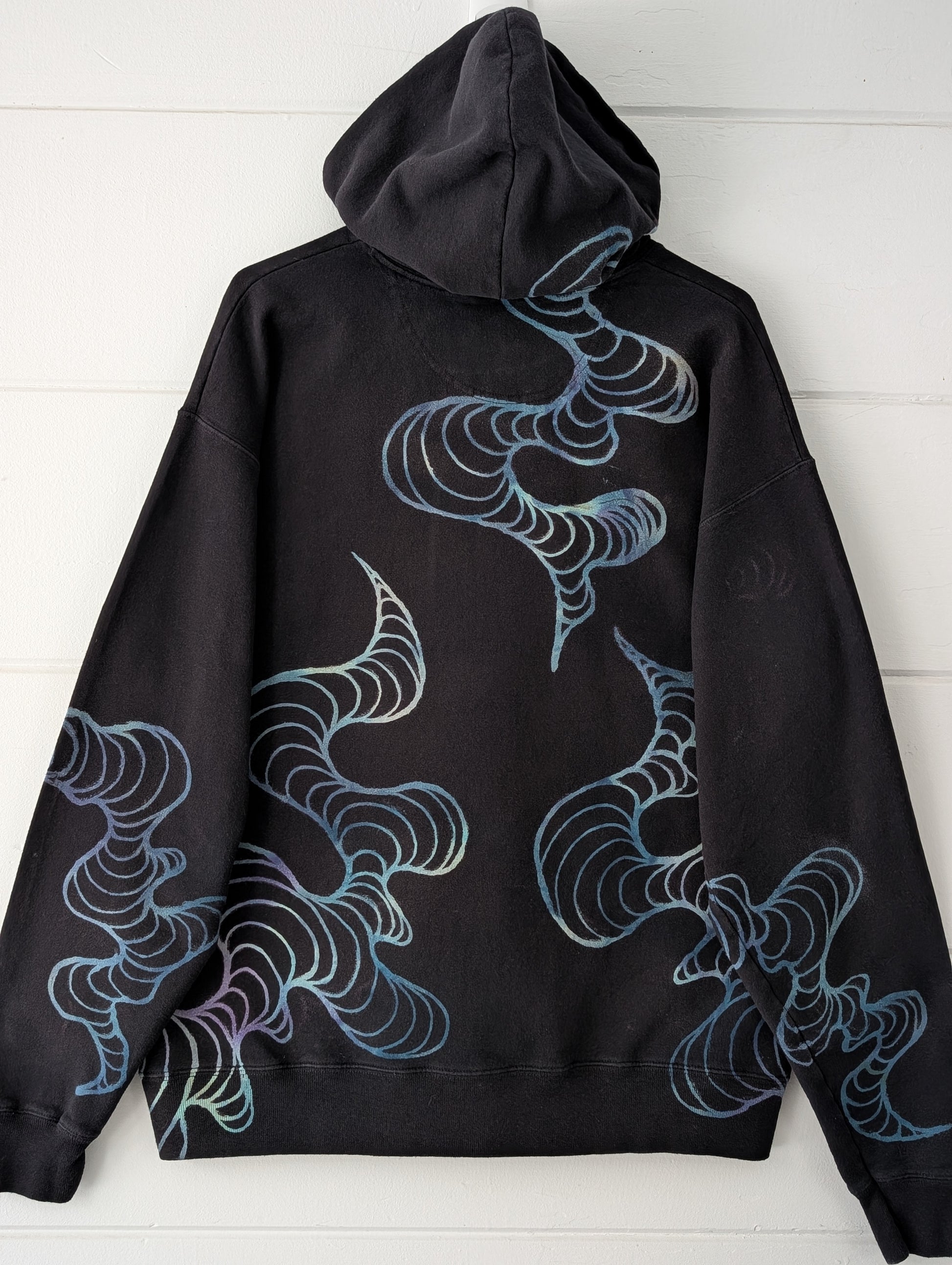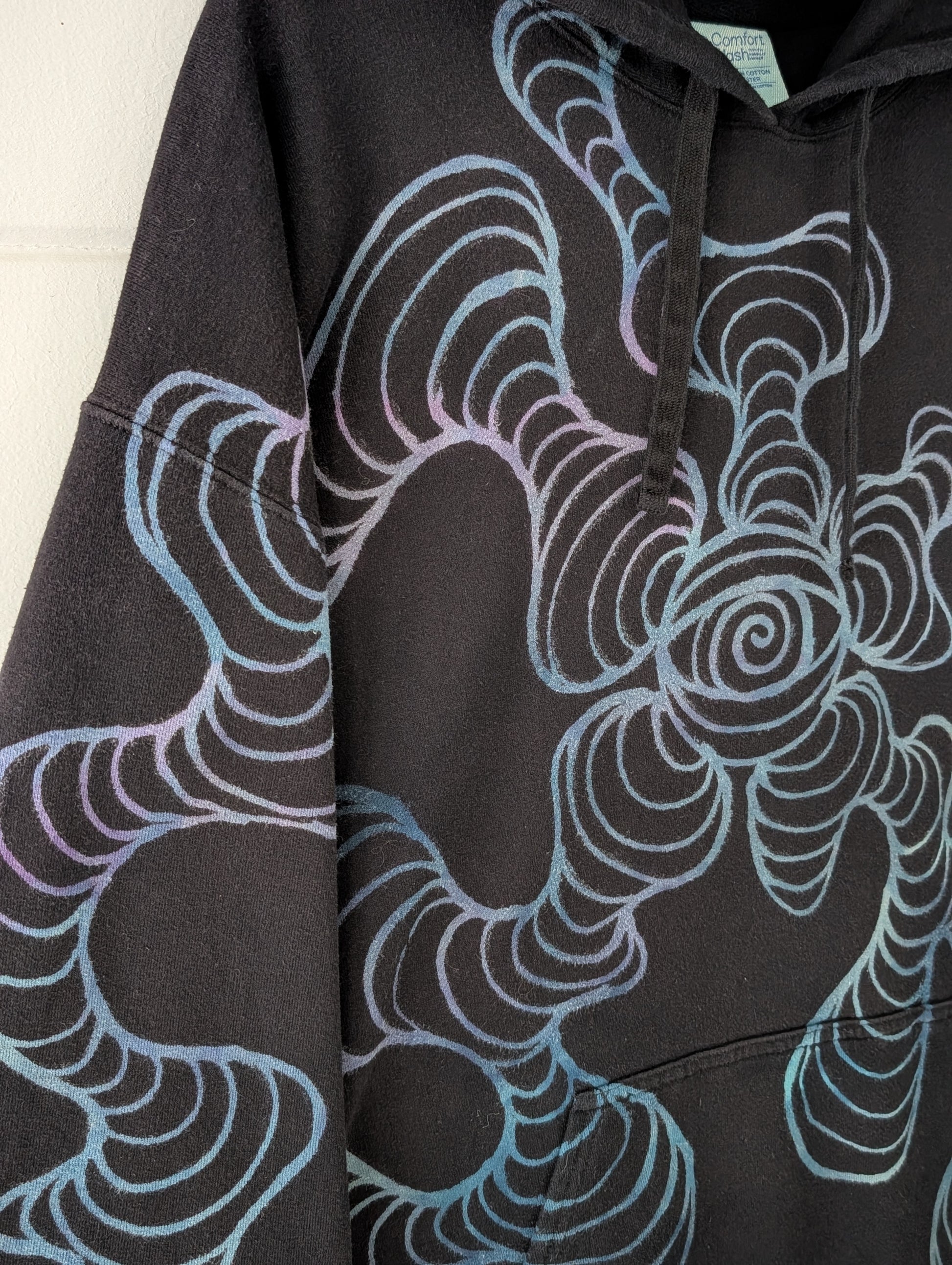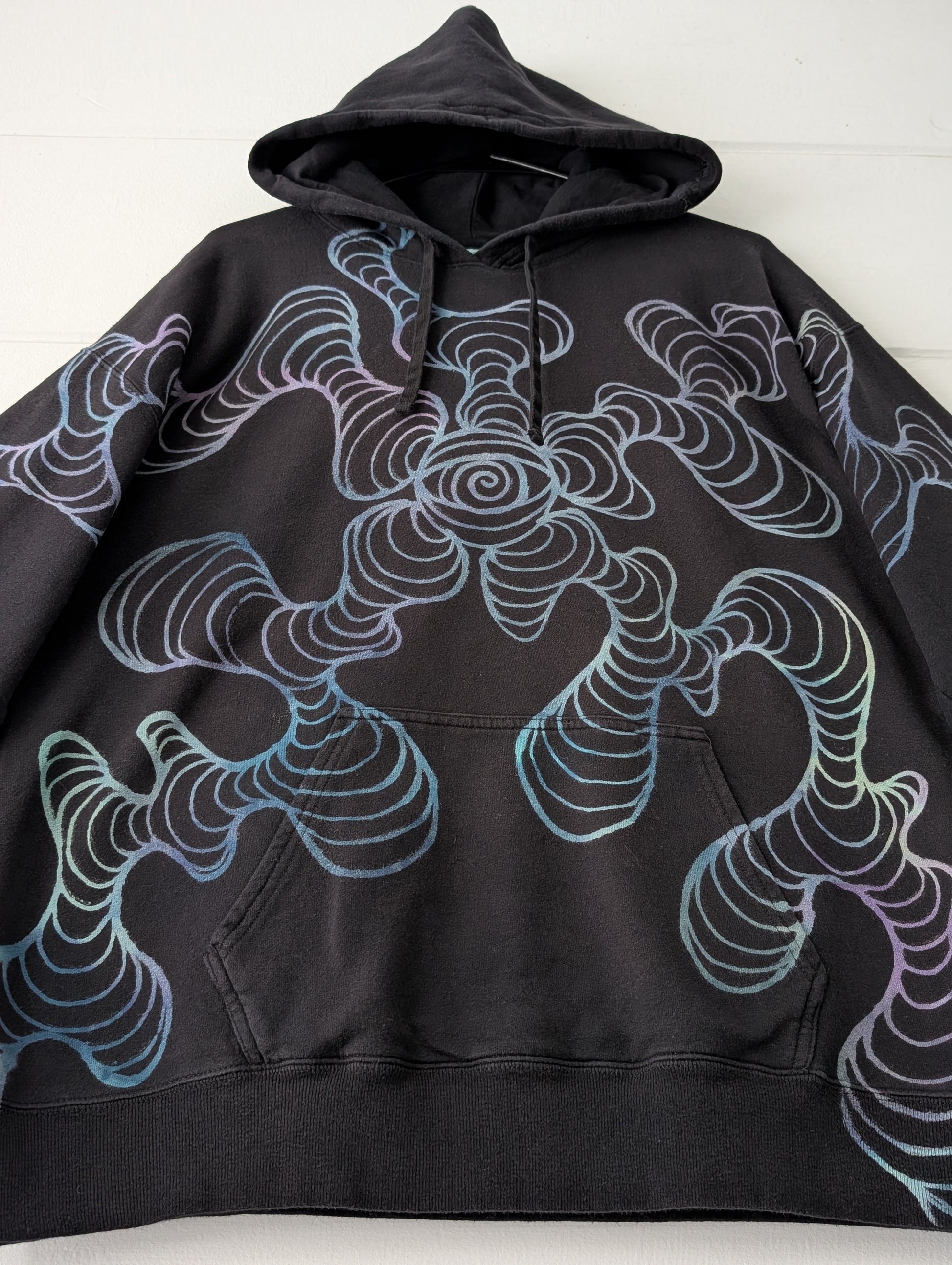 Features a hand drawn one of a kind creation I've named the spunfl꩜wer that wraps its way around the hoodie. This hoodie is 7.2 oz., 80/20 cotton poly blend. The inside lining is a super soft polyester fleece blend. Made with love!