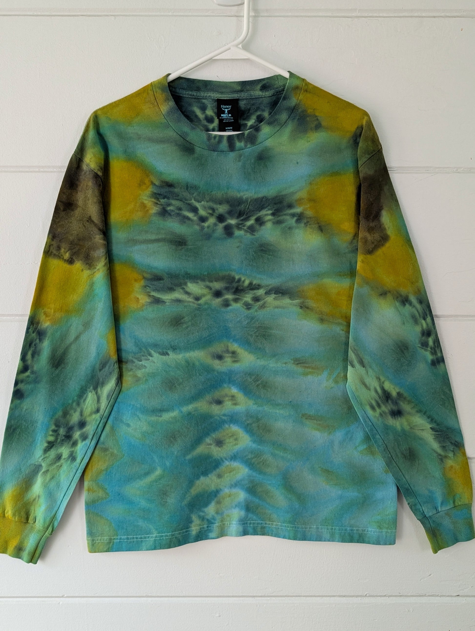 This shirt is 6.1 oz., 100% ringspun cotton. It features a psychedelic ice dyed flowy design. This one of a kind shirt was made with all my love!