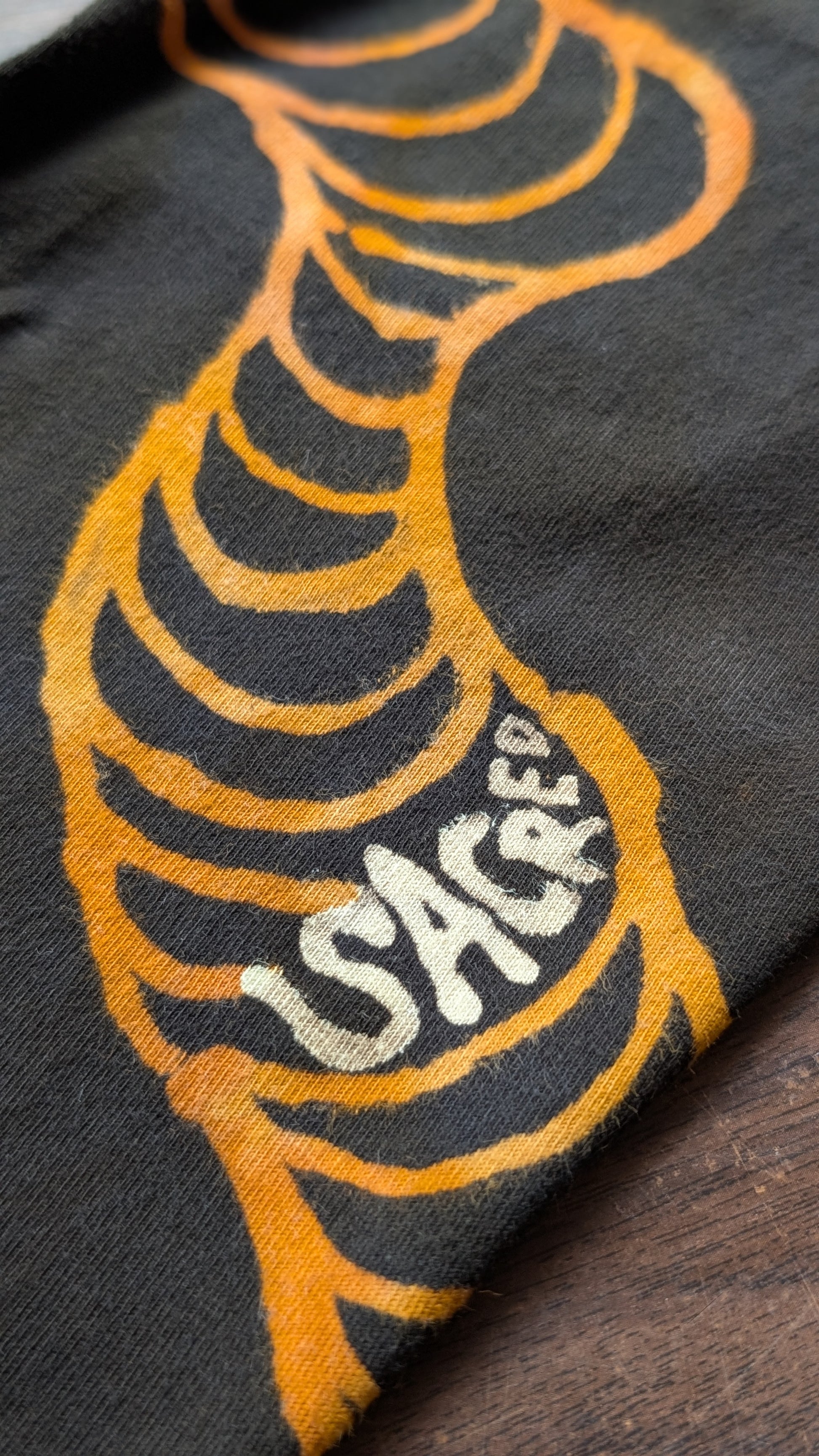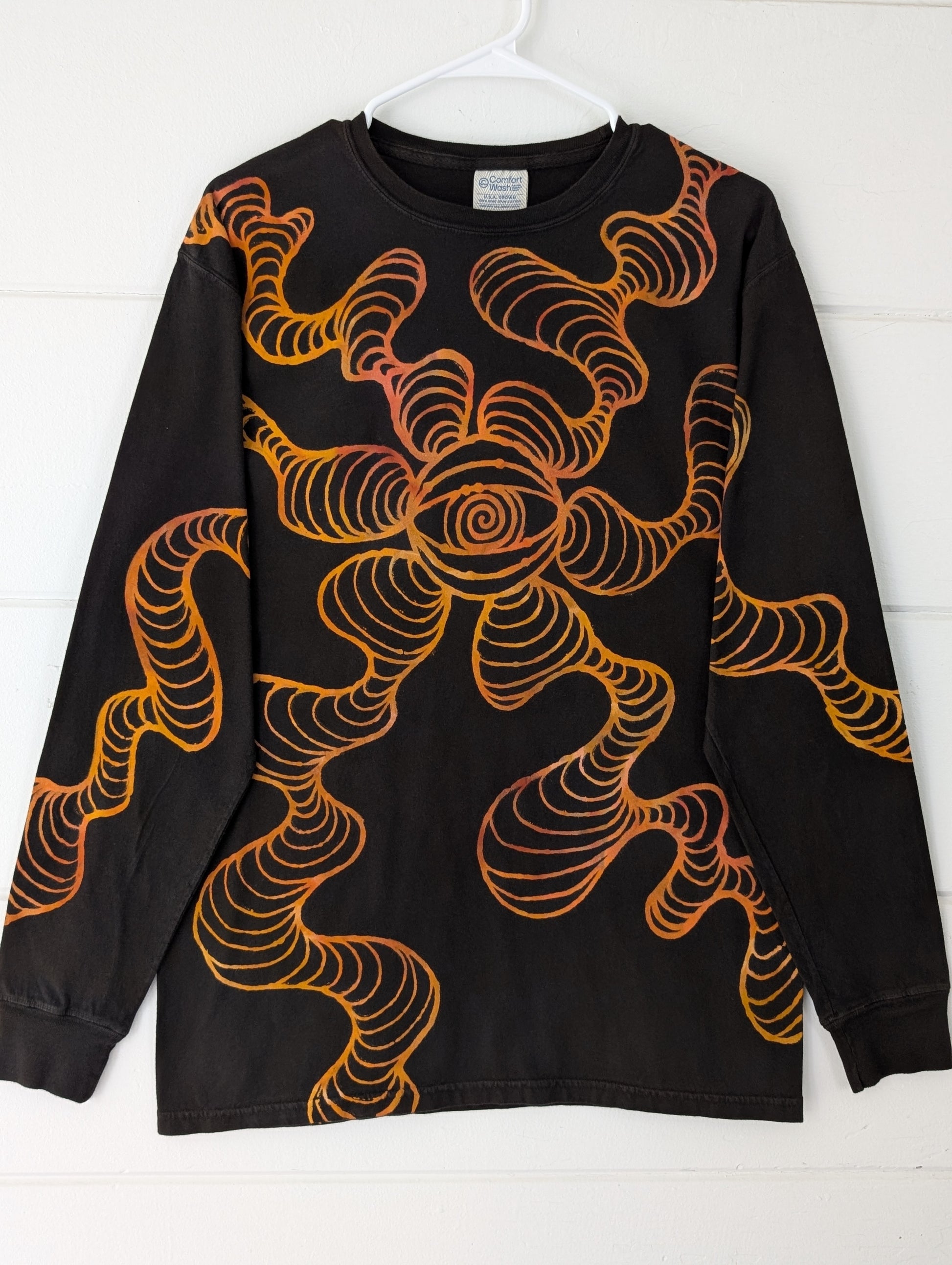 This shirt is 6.1 oz., 100% ringspun cotton. It features a hand drawn one of a kind creation I've named the spunfl꩜wer that wraps its way around the shirt. Then dyed in warm tones! This short was made with so much love.