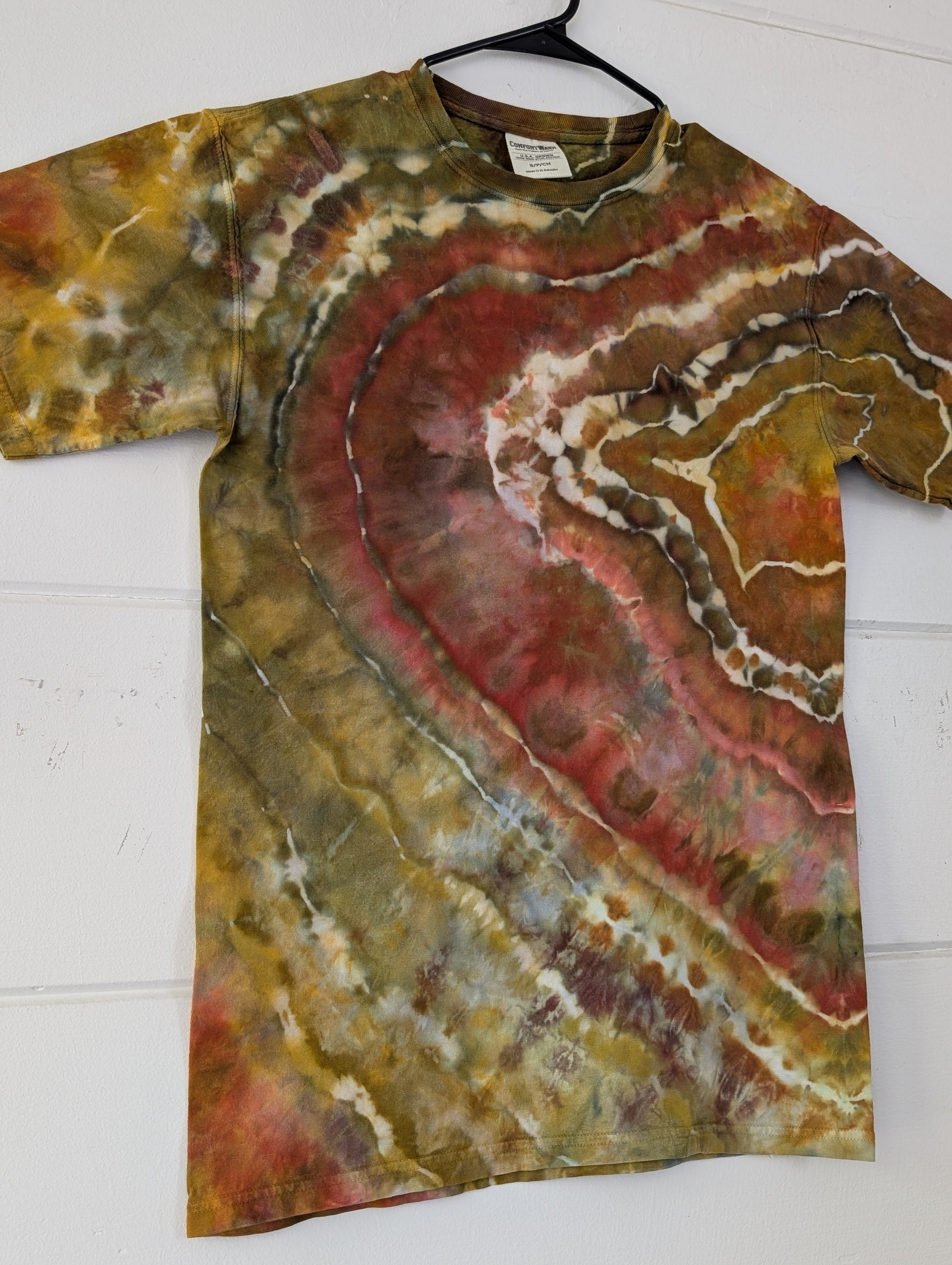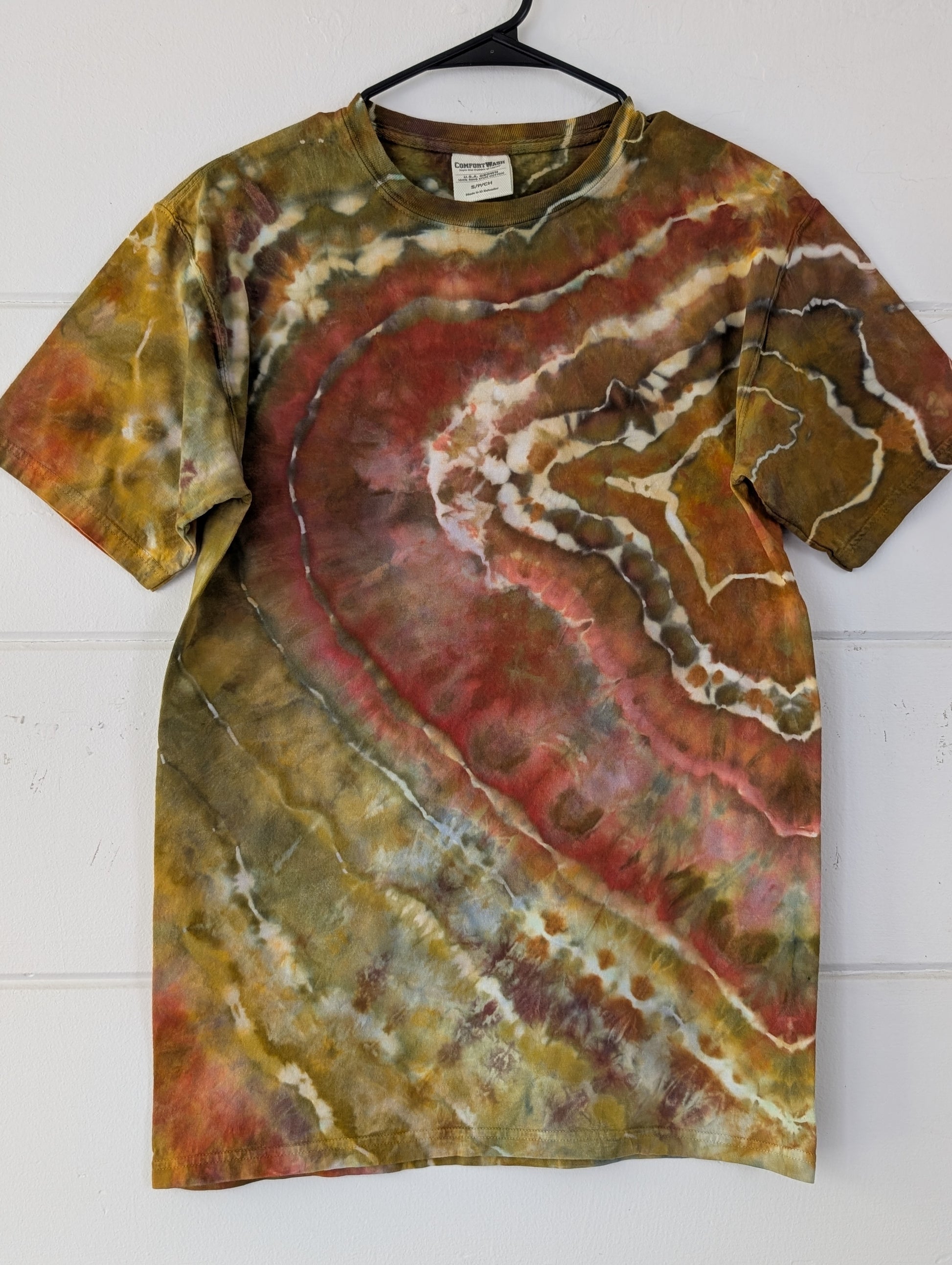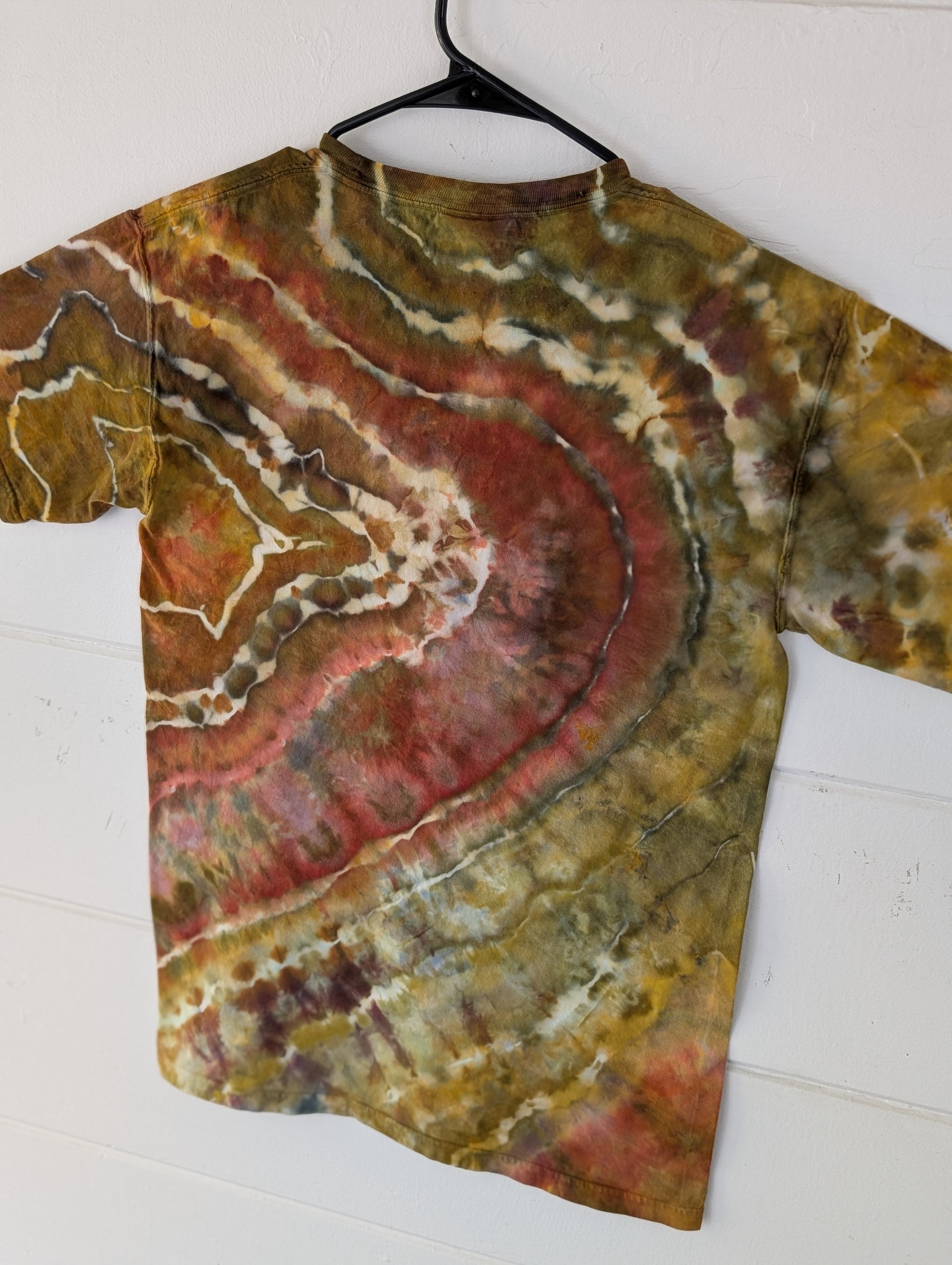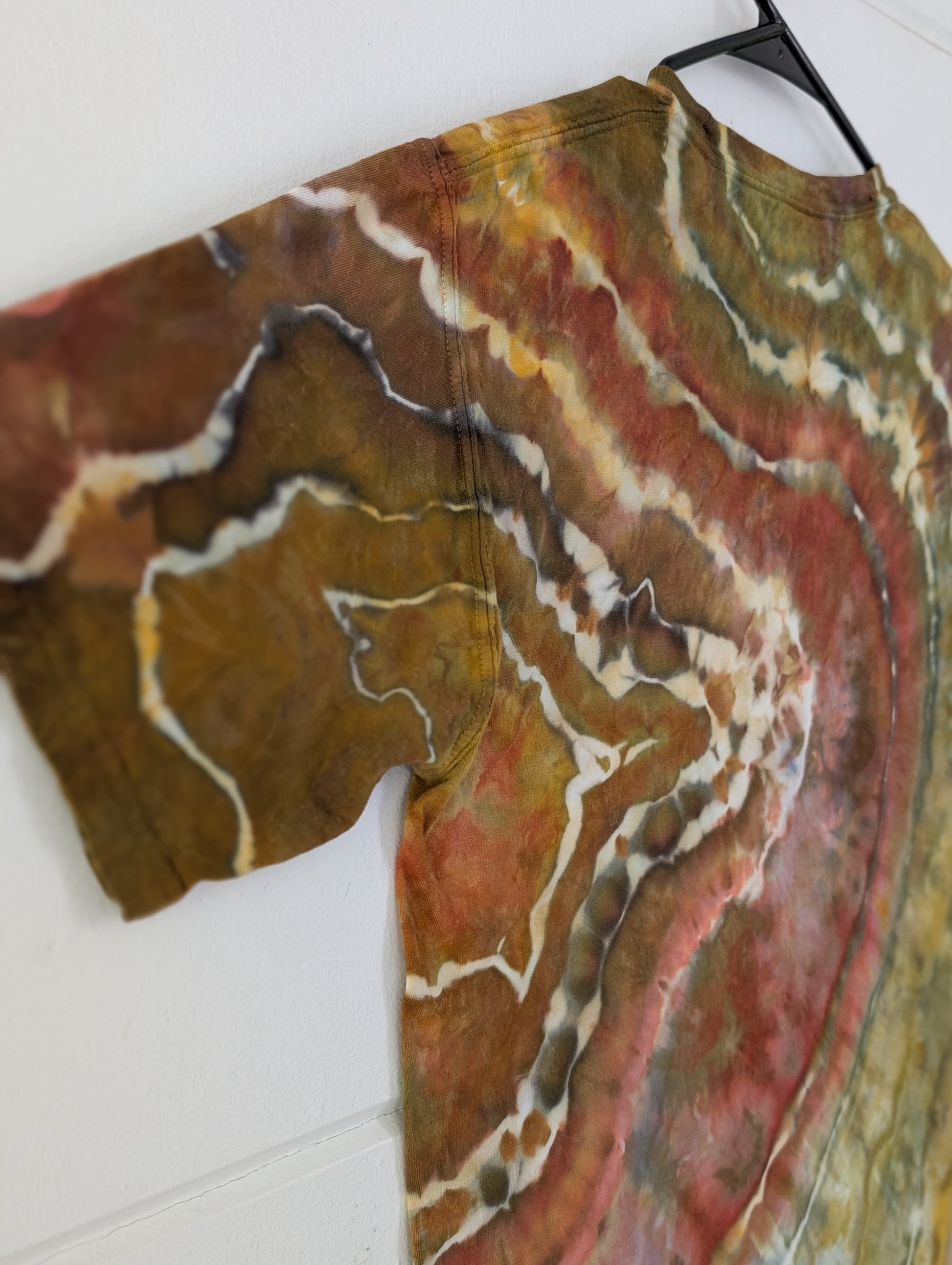This shirt is 5.5 oz., American grown 100% ringspun cotton. It features a psychedelic geode design in earth tones. This shirt was brought into existence with so much love!