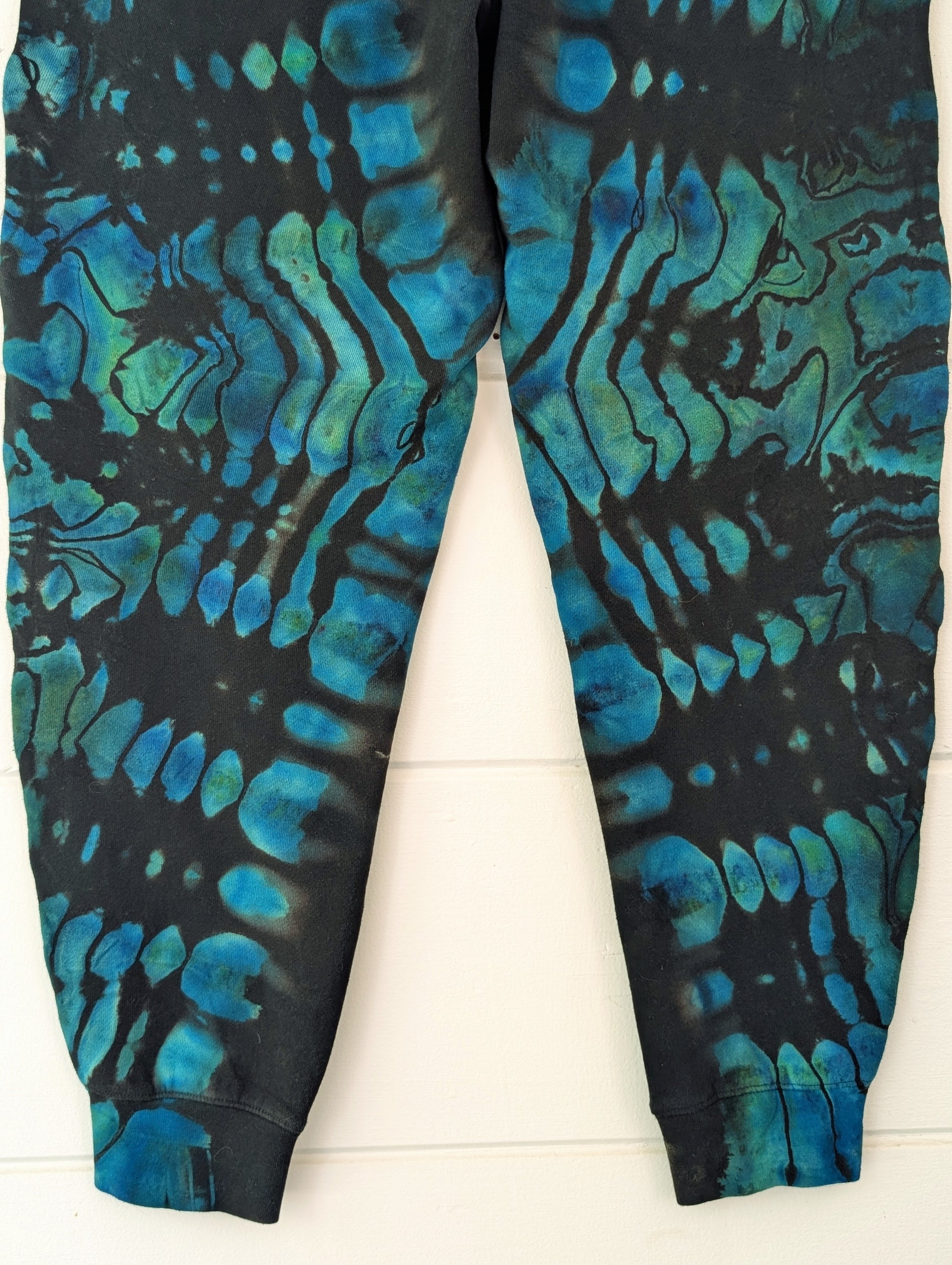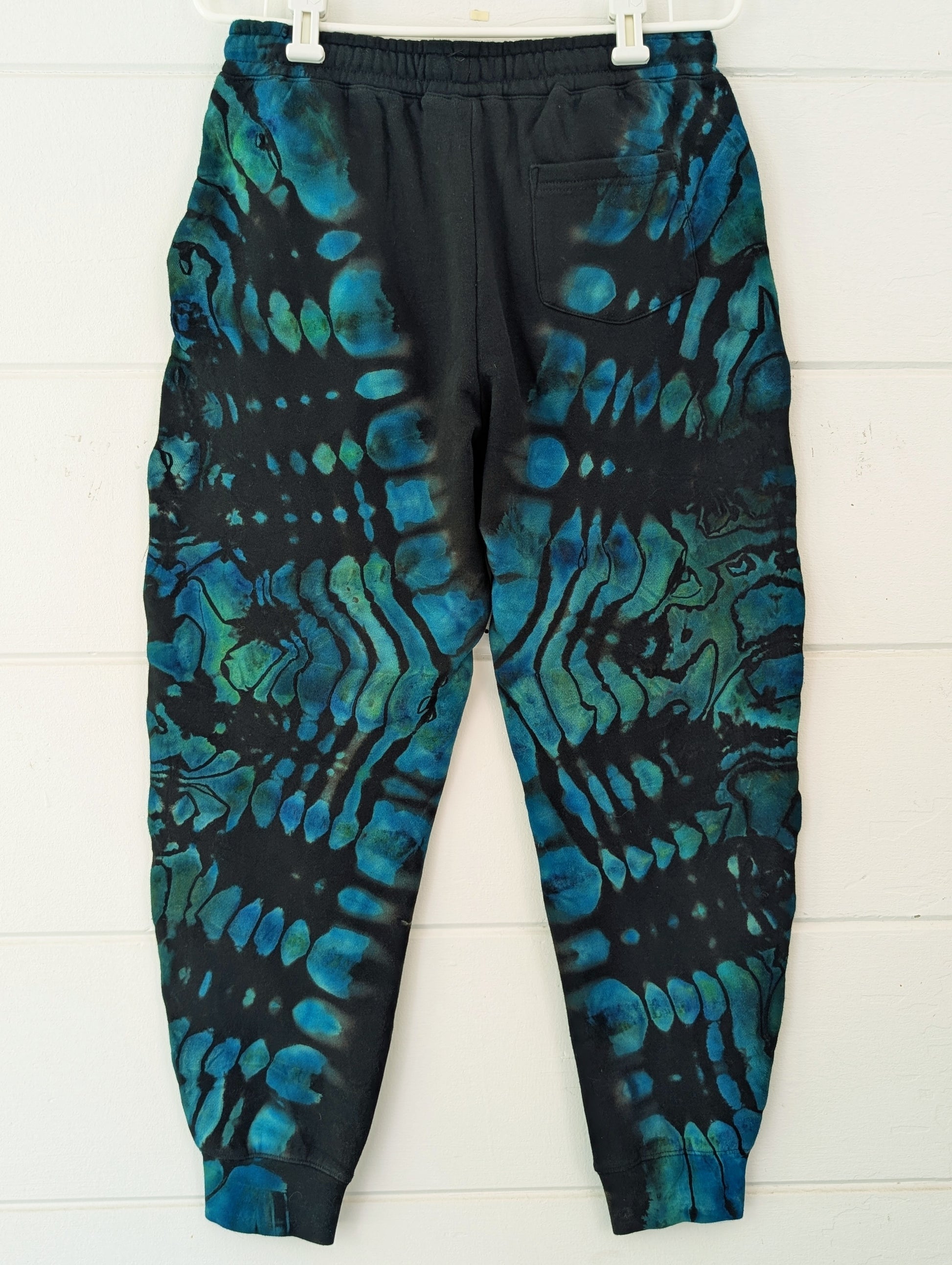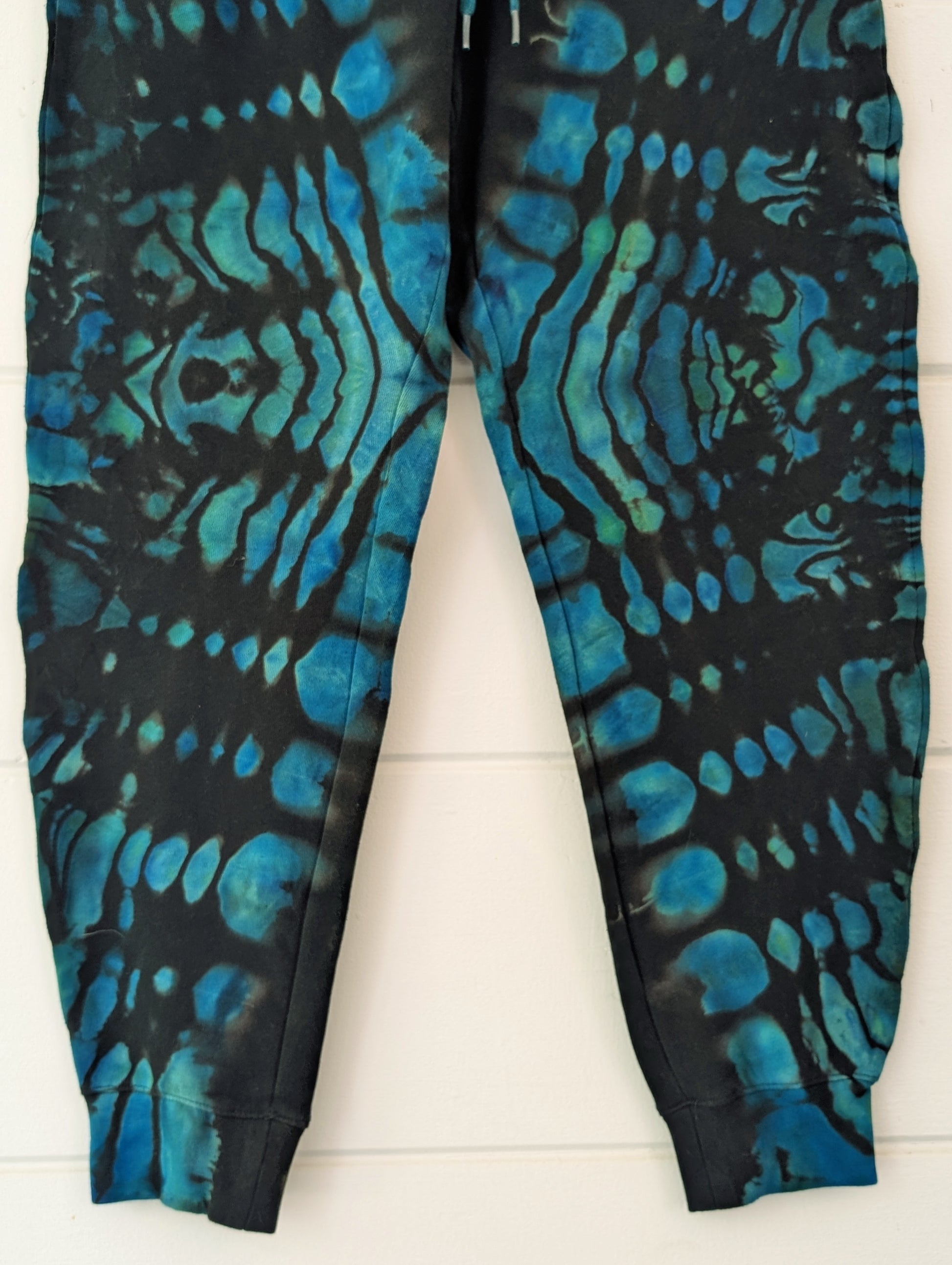 These sweats are 8.5 oz. ring spun cotton. They have a polyester blend fleece on the inside lining, 2 side jersey lined hand pockets and a small back pocket. Each leg has a unique hand dyed psychedelic design and beaded strings. They are warm, cozy & made with so much love!