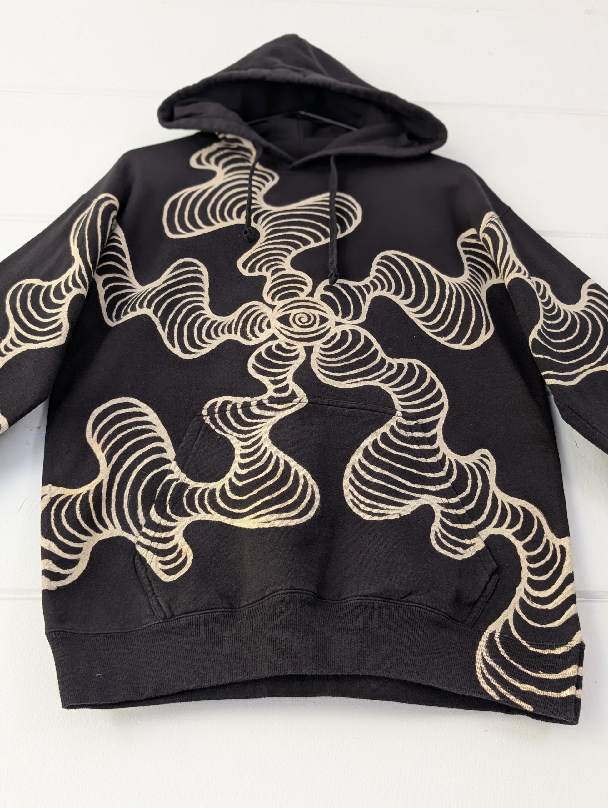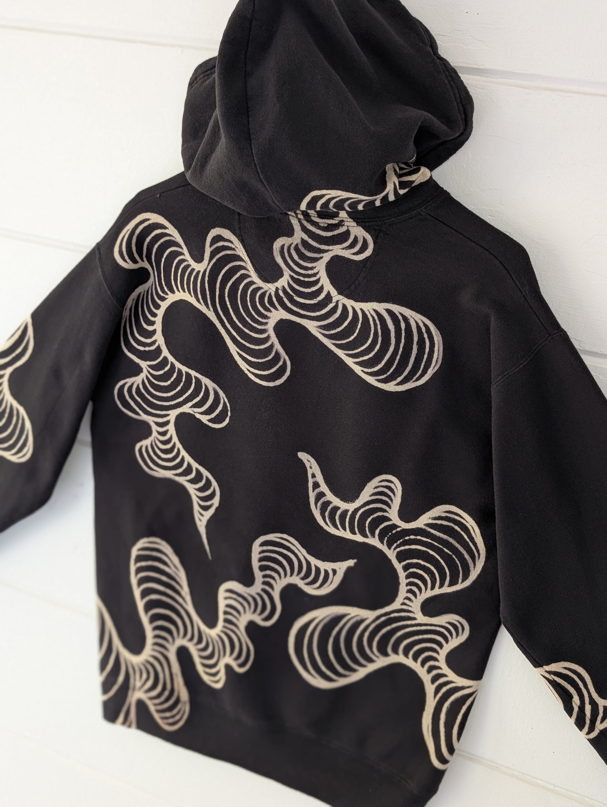 Features a hand drawn one of a kind creation I've named the spunfl꩜wer that wraps its way throughout the hoodie. This hoodie is 7.2 oz., 80/20 cotton poly blend. The inside lining is a super soft polyester fleece blend.
