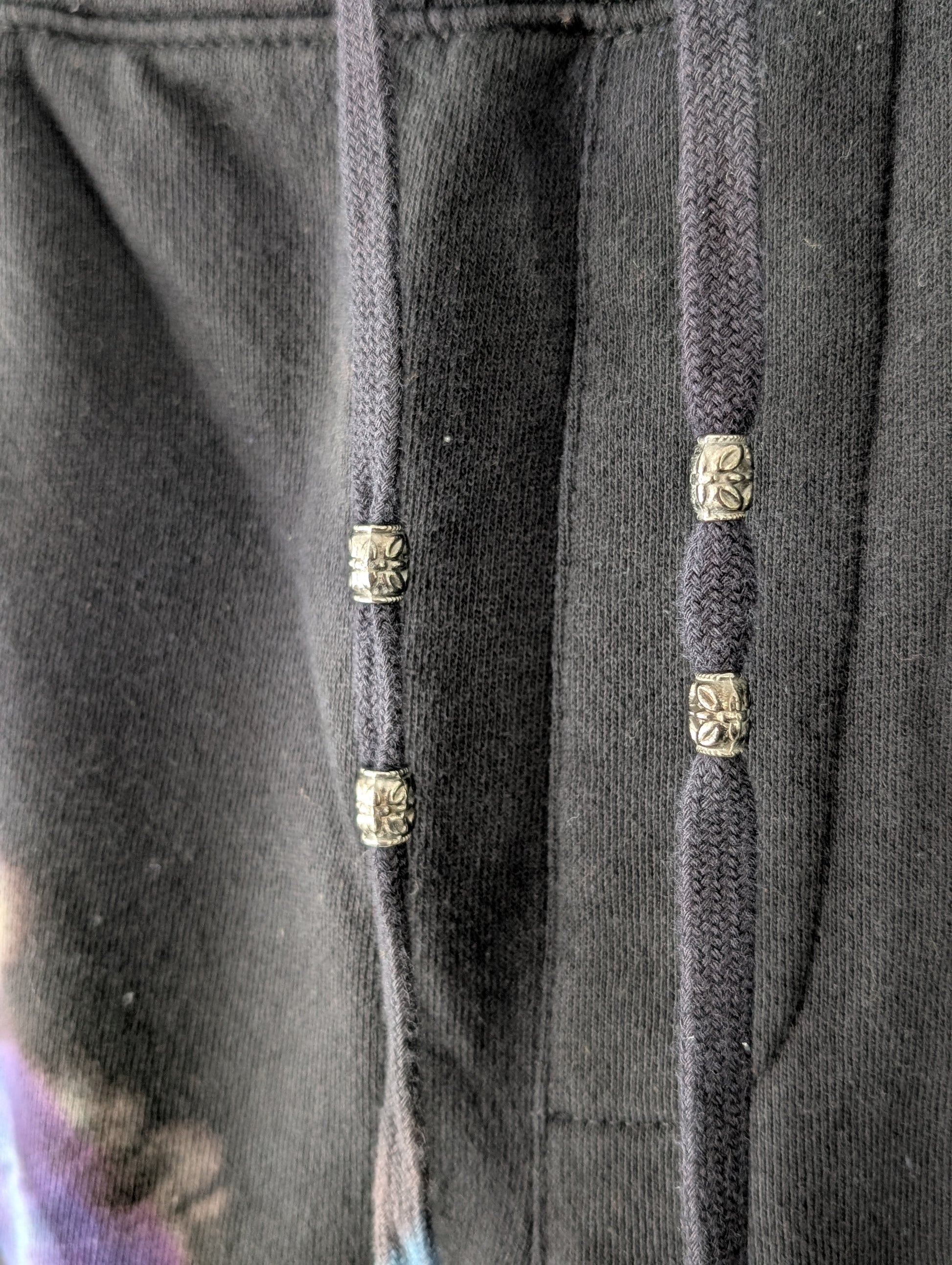 These sweats are 8.5 oz. ring spun cotton. They have a polyester blend fleece on the inside lining, 2 side jersey lined hand pockets and a small back pocket. Each leg has a unique hand dyed psychedelic design and beaded strings. They are warm, cozy & made with so much love!